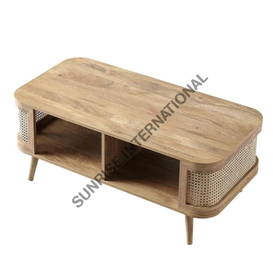 Expertly crafted from high-quality wood, this rectangular coffee center table features beautiful rattan cane work and a convenient bottom shelf. Add an elegant and functional touch to your living space with this unique piece that combines style and storage. Perfect for any modern or traditional interior design.