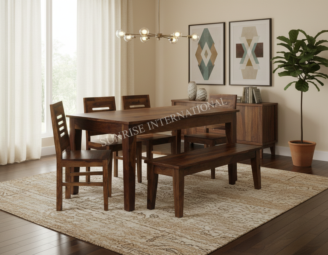 Transform your dining space into a gathering hub with this sleek contemporary wooden dining table paired with four matching chairs and a cozy bench. Crafted from quality wood, this five-piece set strikes the perfect balance between modern style and timeless warmth. Whether you're hosting dinner parties or enjoying casual family meals, the spacious table accommodates everyone comfortably. The bench adds flexible seating and a touch of laid-back charm, while the four chairs ensure no one's left standing. It's the kind of furniture that makes people actually want to linger at the table—and isn't that what dining together is all about?