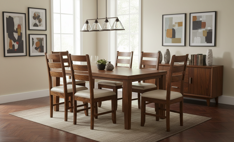 Add a dash of elegance to your kitchen with a polished wooden dining table set with intricate details. Make a style statement with chic dining room furniture. Don't just settle on style over space and necessity. These dining table sets will add grandeur to your living area. Spacious tables, tall chairs and rich wood finishes of mahogany, teak and walnut makes for a visual treat. Added bench storage makes it easy to entertain extra company.