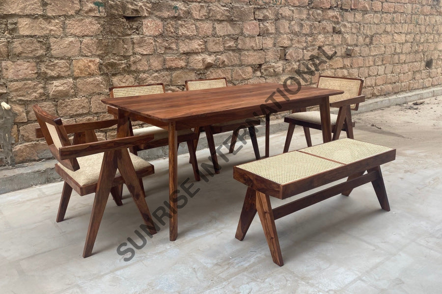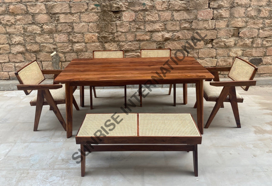 Elevate your dining space with our Mid Century Wooden Dining table Armchair Bench furniture set. Crafted from solid wood and accented with elegant Rattan cane, this set exudes timeless sophistication. Choose your combination of armchairs and benches to create a bespoke look that fits your style.
