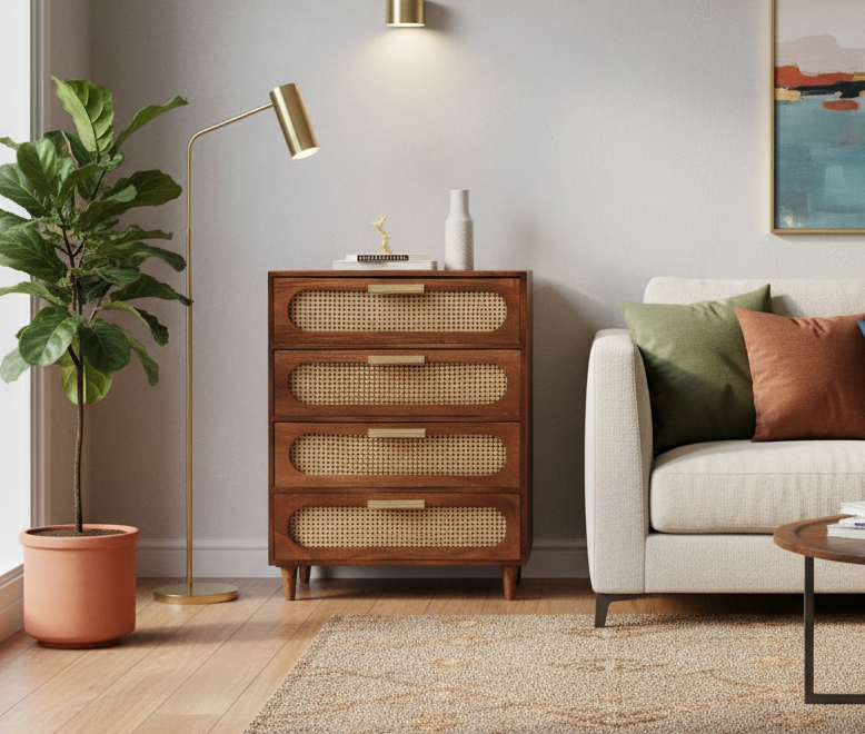 Bring timeless, mid century style to your home with this handmade wooden chest of drawers cabinet. Crafted with hand with beautiful rattan cane work, it adds charm and sophistication to any room. Perfect for storage or everyday living.