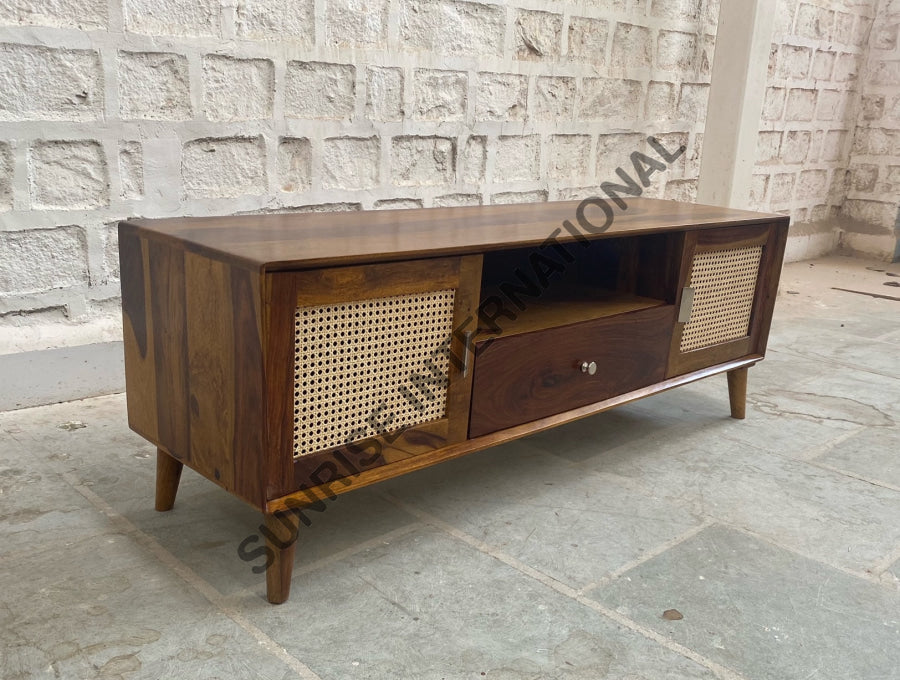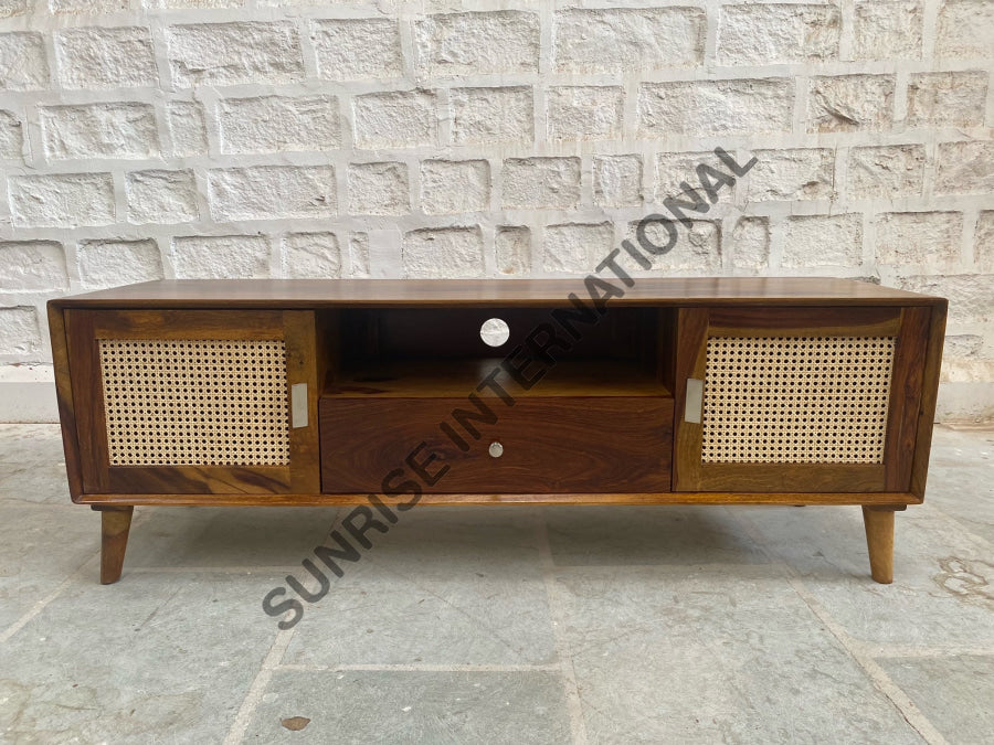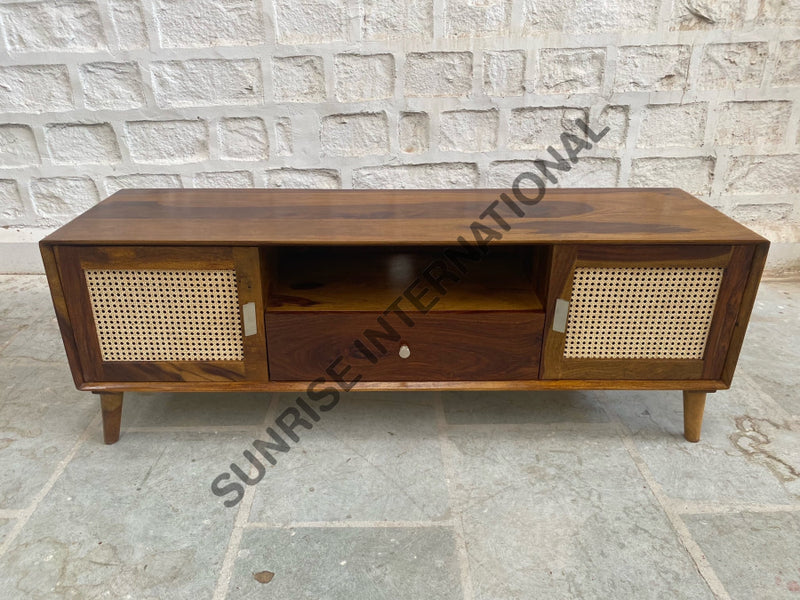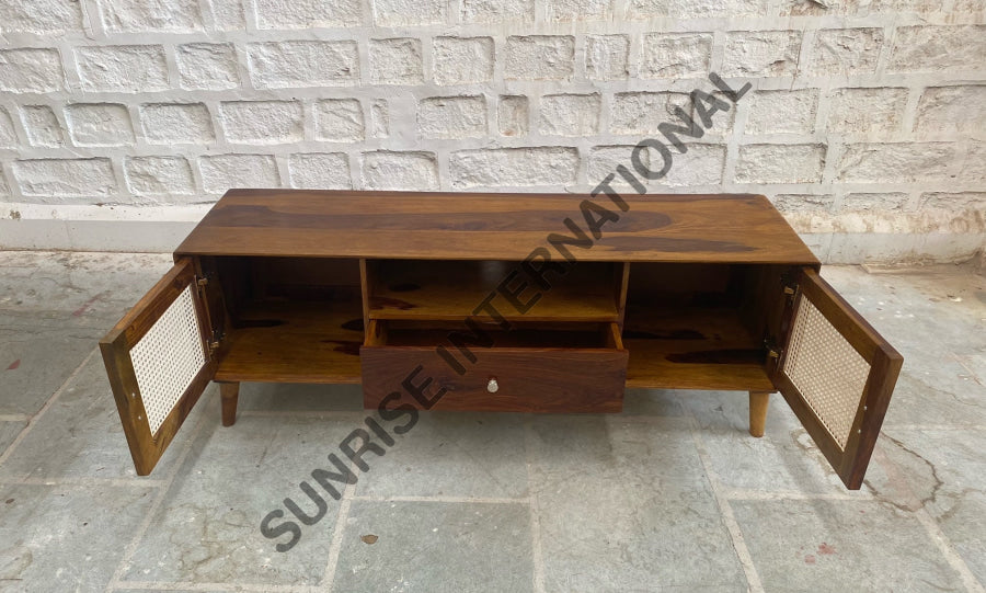 This mid century wooden TV cabinet features a unique rattan cane work detail, offering a timeless style that will be a statement in any living space. The cabinet is expertly crafted from solid sheesham wood, ensuring durability and strength. Add a touch of modern style to your home.