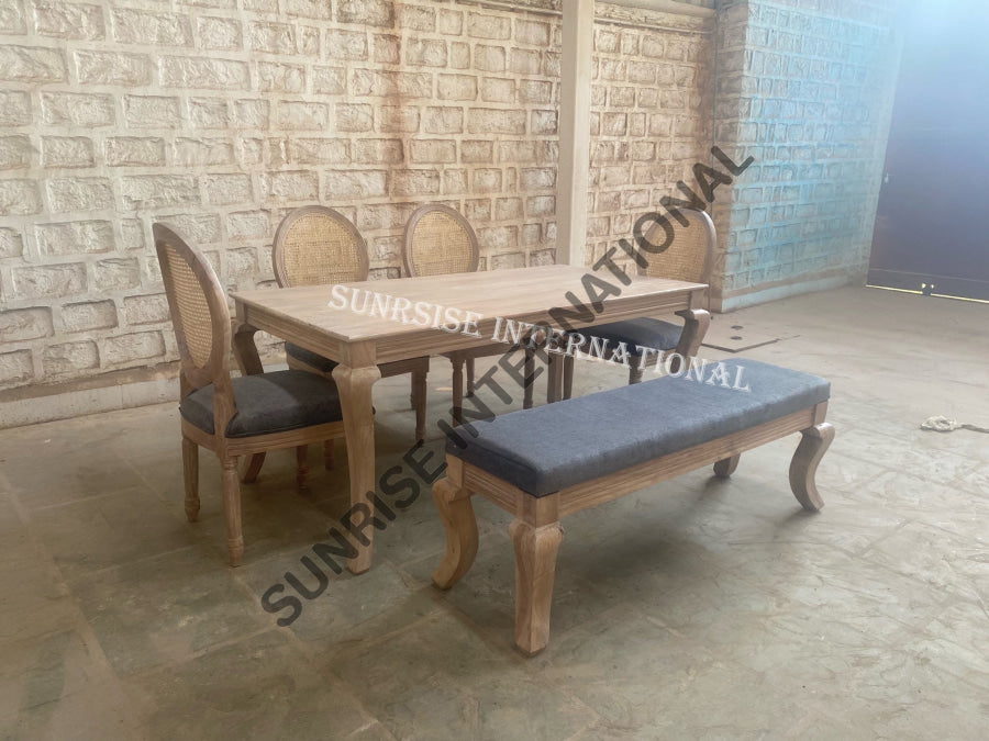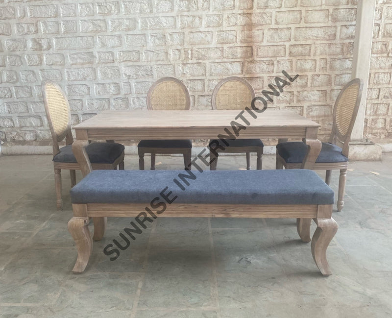 Add a touch of elegance to your dining room with our French style solid wood dining table, chair, bench set. Crafted with sturdy solid wood, this set exudes sophistication and durability. The perfect addition to any home for formal dinners and family gatherings.