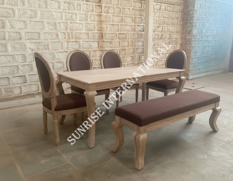 Add a touch of elegance to your dining room with our French style solid wood dining table, chair, bench set. Crafted with sturdy solid wood, this set exudes sophistication and durability. The perfect addition to any home for formal dinners and family gatherings.