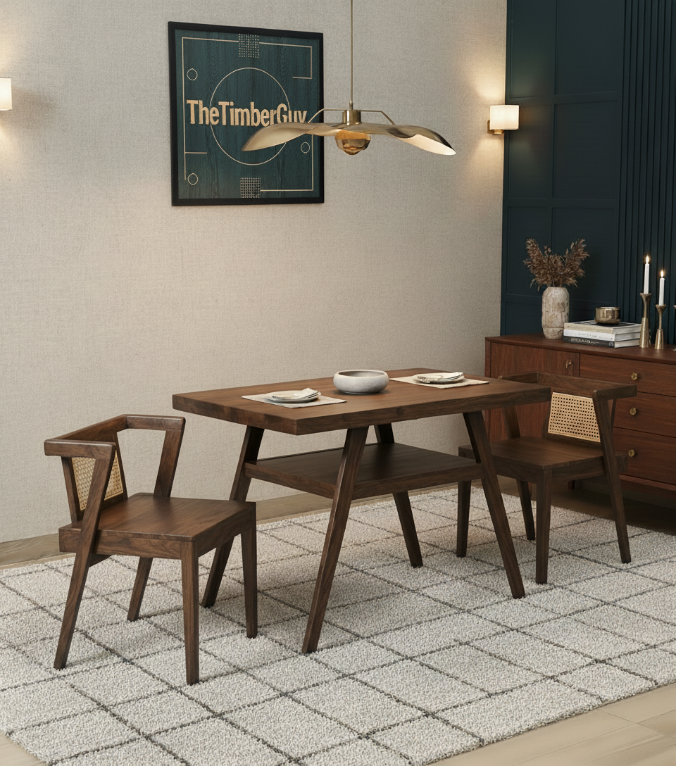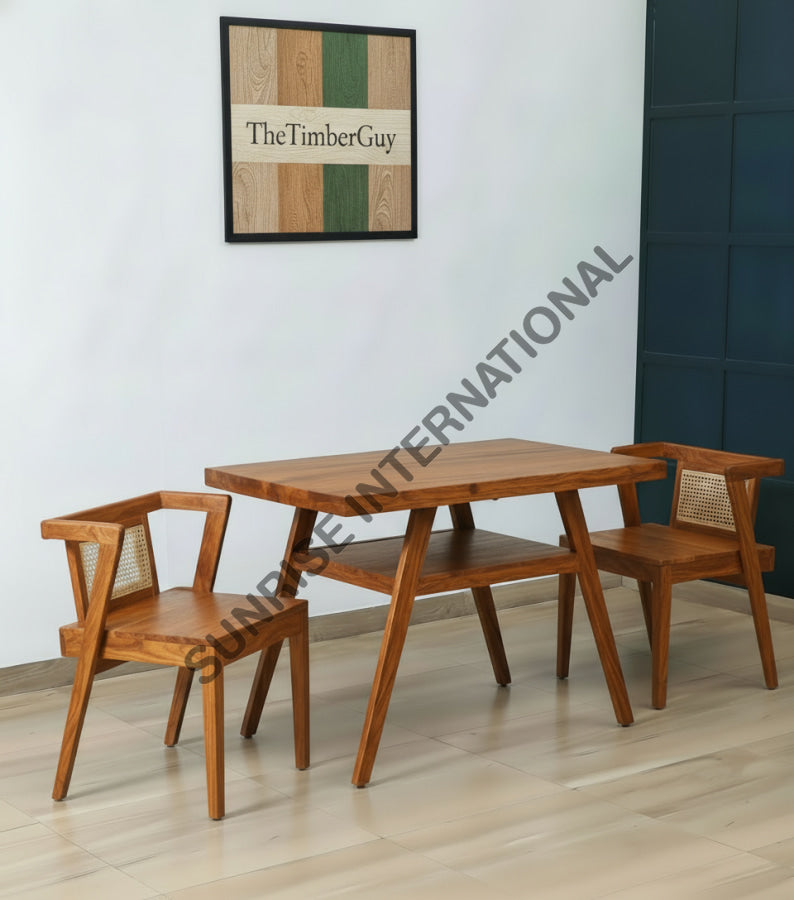 Elevate your dining experience with our Nordic Design Wood 3pc Wooden Dining Table Set. Crafted with exquisite rattan cane detailing, this set is perfect for both restaurants, cafe and homes. The set includes 1 table and 2 chairs, all made with premium quality wood. Enjoy a touch of elegance and sophistication with every meal.