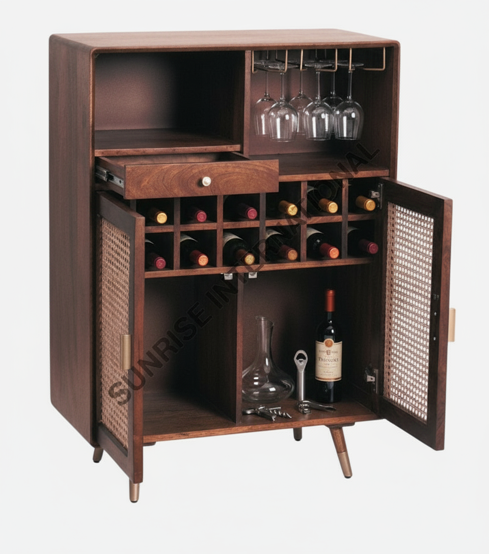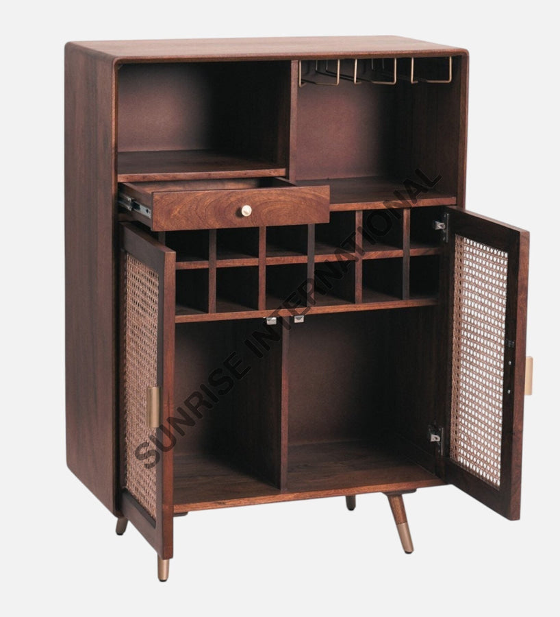 Elevate your home bar with this Retro Style Solid Wood Rattan Cane Bar Cabinet, blending classic charm with functional design. Crafted from solid wood and woven rattan cane, it offers durable storage and a warm, textured appeal. The built-in glass holder keeps your stemware organized and accessible, making entertaining effortless. Perfect for adding a sophisticated vintage touch to any space while keeping your bar essentials neatly stowed.