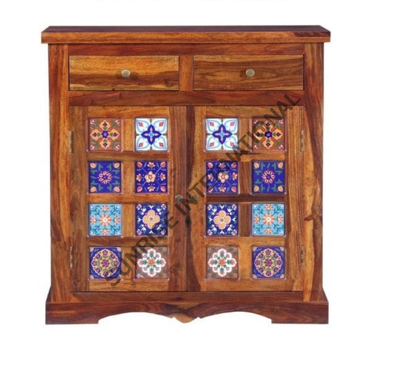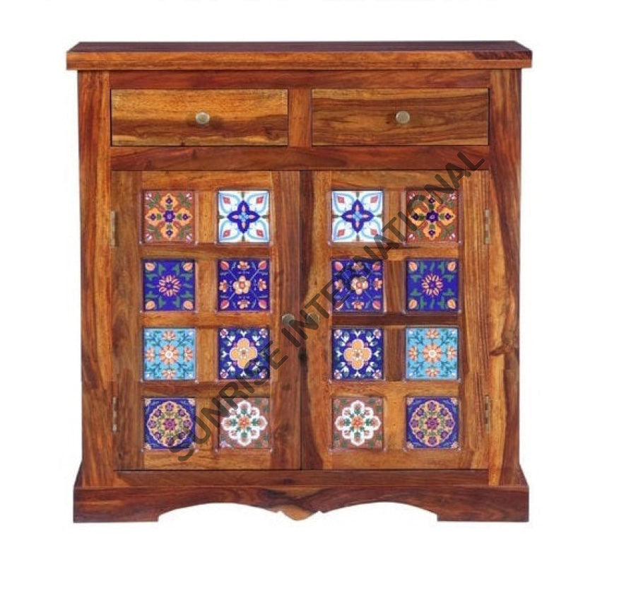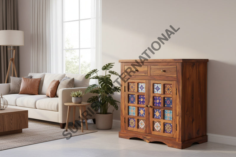 Elevate your living space with this stunning solid sheesham wood sideboard cabinet, a perfect blend of functionality and artistic design. Crafted by Sunrise International, this contemporary piece features hand-applied ceramic tiles that add a unique, decorative touch to any room. Built from premium sheesham wood with a light teak finish, this sideboard offers ample storage with a sophisticated aesthetic. Measuring 75W x 40D x 88H cms, it fits seamlessly into modern and traditional interiors alike. Each piece is one-of-a-kind, with tile patterns varying slightly to celebrate the artisanal nature of the craft. Ready to place straight out of the box—no assembly required. Made in India with meticulous attention to detail, this cabinet is an investment in quality and style that will last for generations.