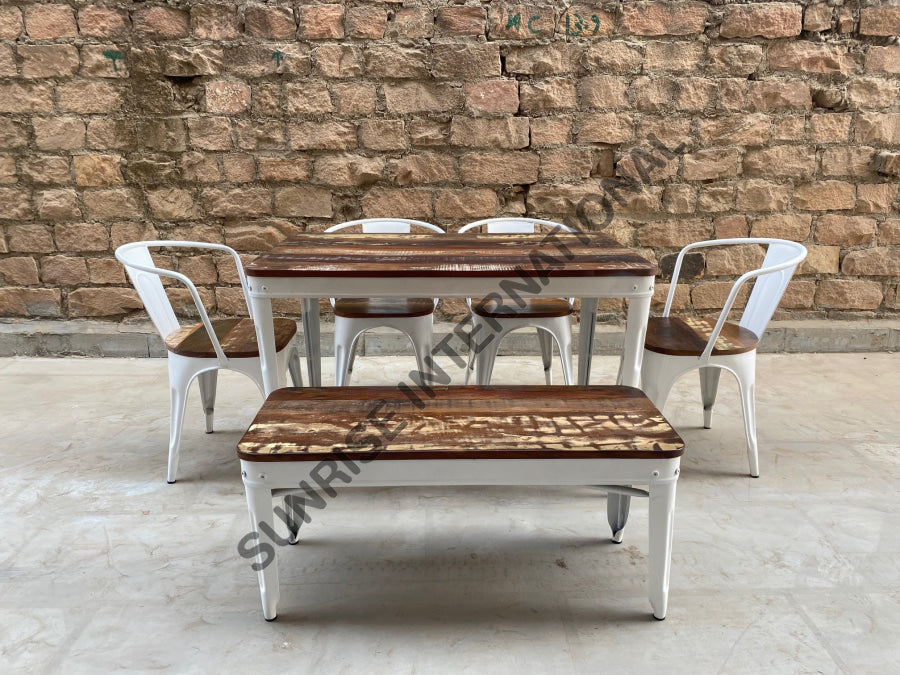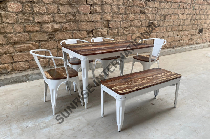 Upgrade your home, restaurant or café with our elegant Solid Wood + Metal Dining table with 4 Tolix style arm chairs & 1 bench furniture set. Crafted with durable materials, this set offers a modern and stylish look, perfect for any outdoor dining space. Enjoy a strong and sturdy dining experience that will impress your guests.